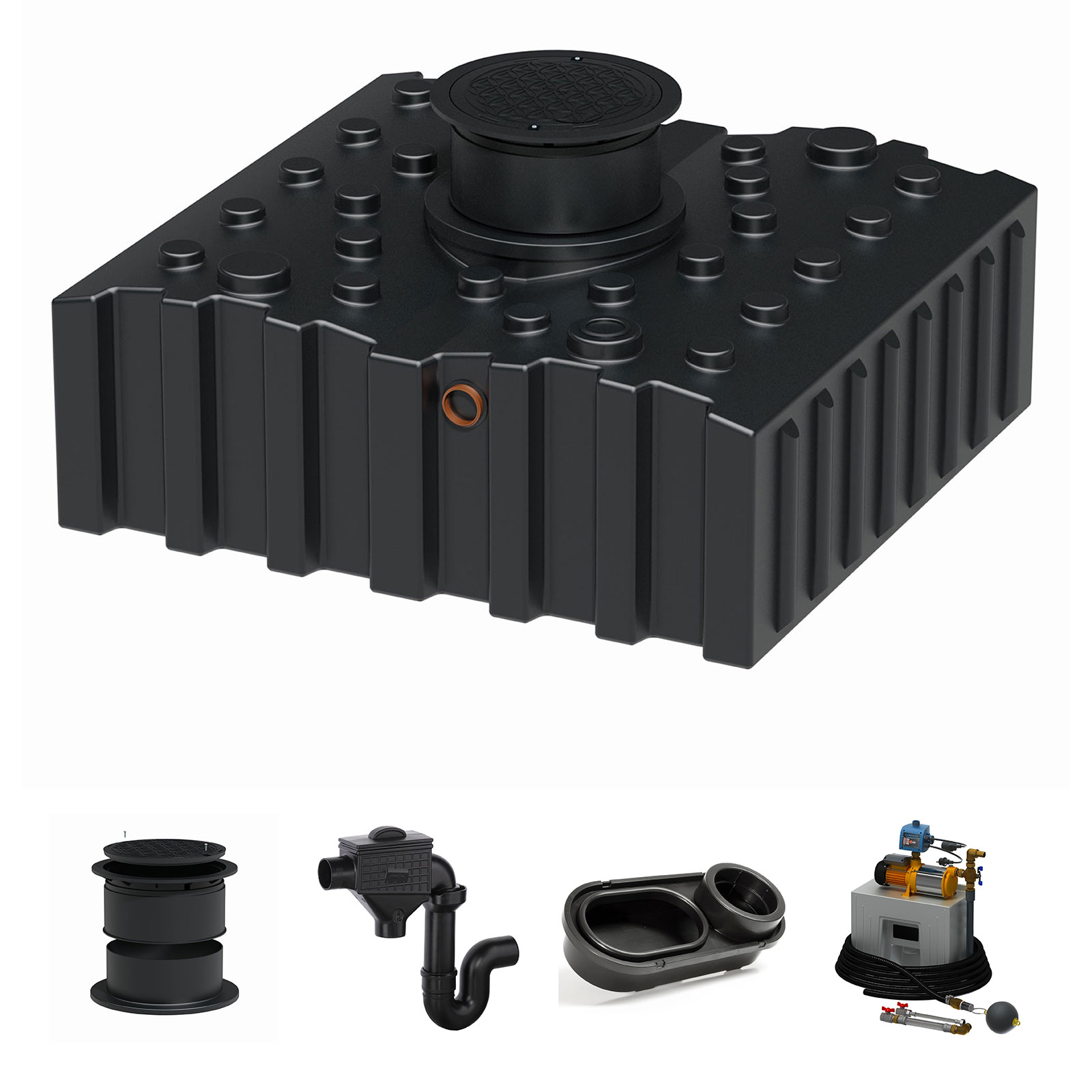 | Im Lieferumfang enthalten: | 1x Florantia Flachtank 4000 Liter, 3x Gummidichtung, Ausgleichsdom (380-580mm) mit begehbarer Abdeckung, Siphonfilter, beruhigter Zulauf DN 100, Tauchpumpen Ausbaupaket Haus Standard I |